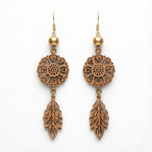 Boho Mandala with Leaf Wooden Dangle Earrings