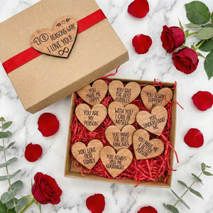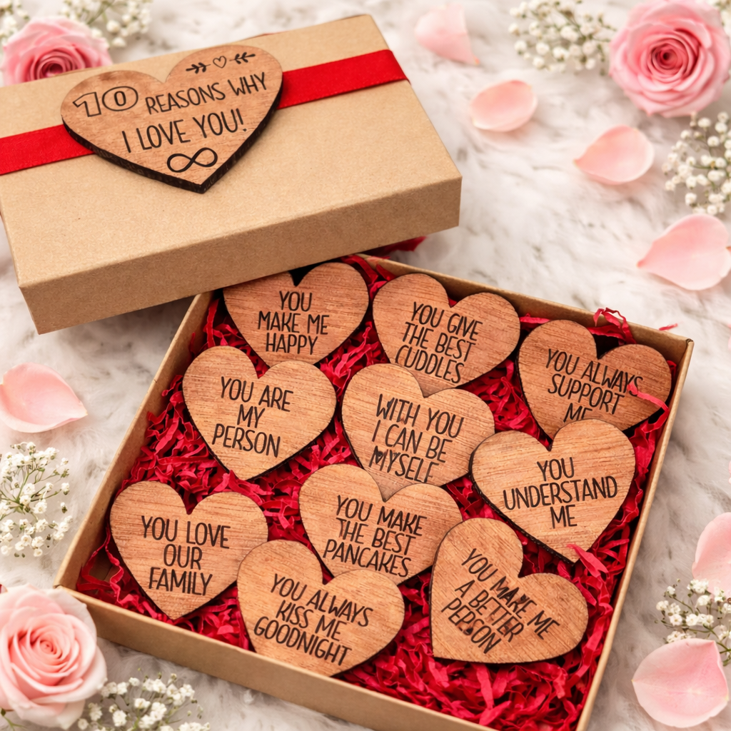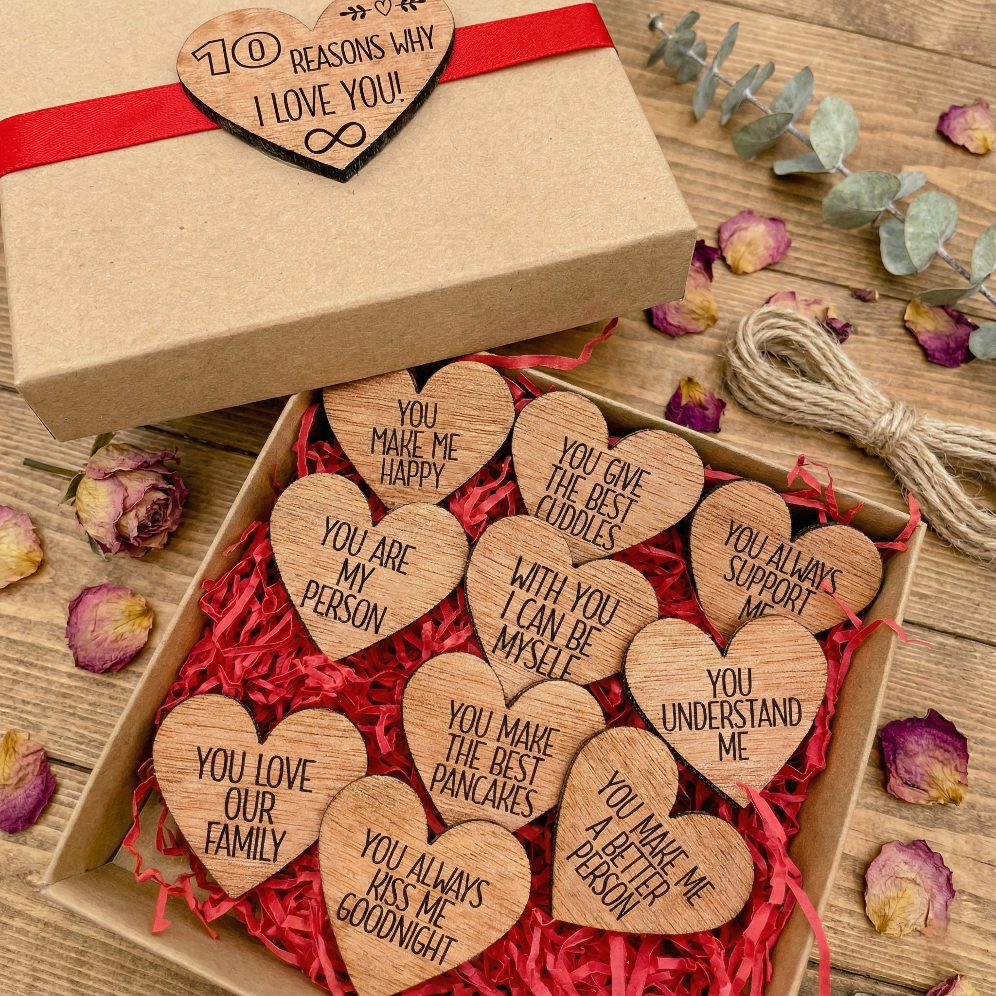 📝 10 Love Reasons – Each reason engraved on individual wooden tokens